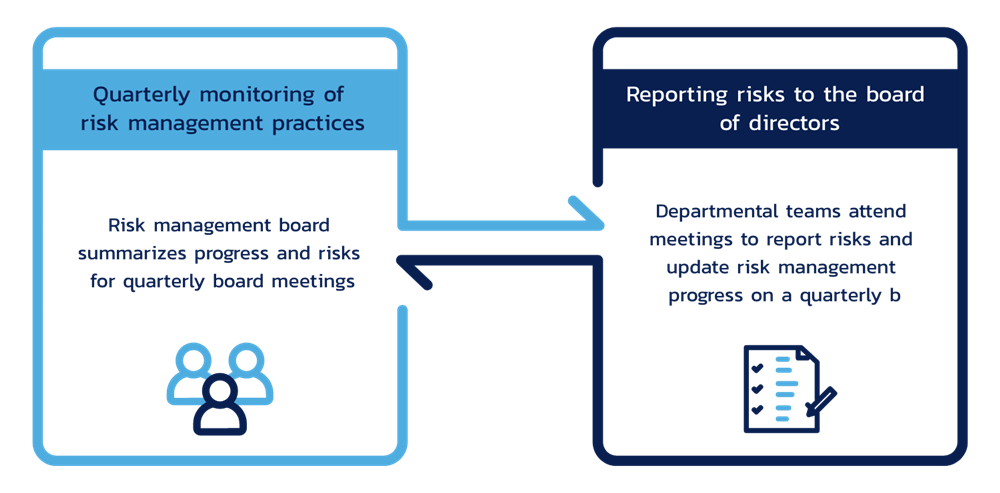 The Investor Relations and Sustainability department will review operational practices after meetings with representatives from the Risk Management department to screen risk levels for each topic. This involves identifying topics with high or very high risks and forwarding them to the Risk Management Committee and the Company's board for discussion to develop mitigation strategies jointly. Additionally, the Investor Relations and Sustainability department will track the risk management processes of each department quarterly. This ongoing monitoring ensures that the Risk Management Committee and the Company's board are well-informed and can respond appropriately to evolving risks.