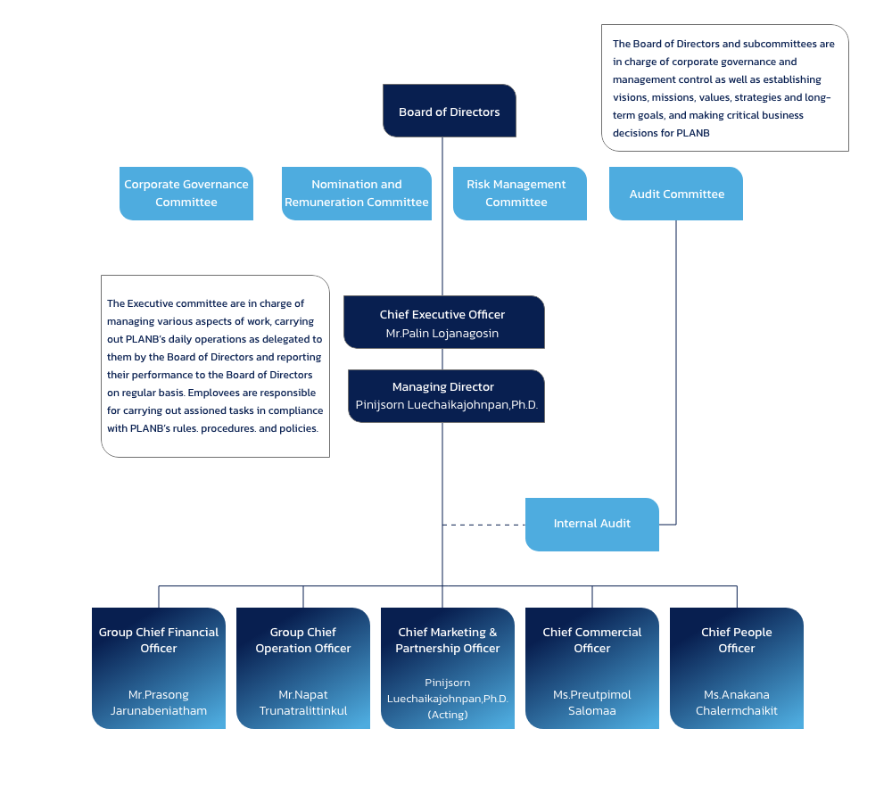 PLANB has established a business structure, management system, and governance framework that aligns with the good governance principles of the Stock Exchange of Thailand, the Securities and Exchange Commission Office, the recommendations of the Thai Institute of Directors Association, and various international standards.