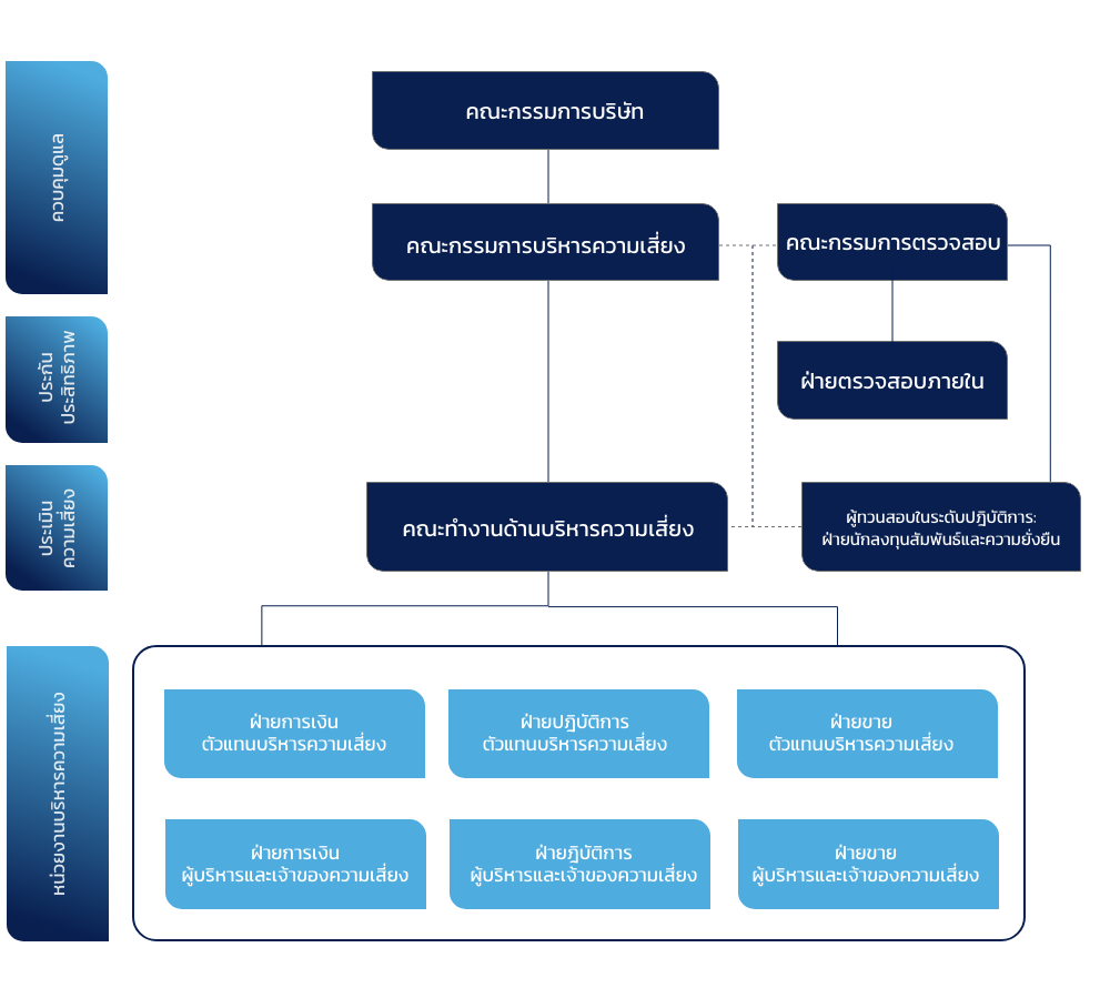 บริษัทได้กำหนดกรอบการบริหารความเสี่ยงองค์กรตาม The Committee of Sponsoring Organization of the Tradeway Commission (COSO) ซึ่งมีการใช้ทั่วทั้งองค์กรผ่านการดำเนินตามนโยบายการบริหารจัดการความเสี่ยงของบริษัทกับพนักงานทุกระดับ คณะกรรมการบริหารความเสี่ยงของบริษัท (RMC) ได้กำหนดนโยบายและกรอบการบริหารความเสี่ยงองค์กร โดยมีคณะกรรมการบริหารความเสี่ยง (RMC) เป็นผู้รับผิดชอบในการควบคุมดูแลความเสี่ยงตามกรอบและนโยบายที่กำหนด ในขณะเดียวกันฝ่ายบริหารความเสี่ยงจะเป็นผู้สนับสนุนการดำเนินงานที่เกี่ยวข้องกับการจัดการความเสี่ยง ซึ่งหมายรวมถึงการรวบรวมข้อมูล การจัดฝึกอบรม และการส่งเสริมวัฒนธรรมการจัดการความเสี่ยงให้เกิดขึ้นทั่วทั้งองค์กร