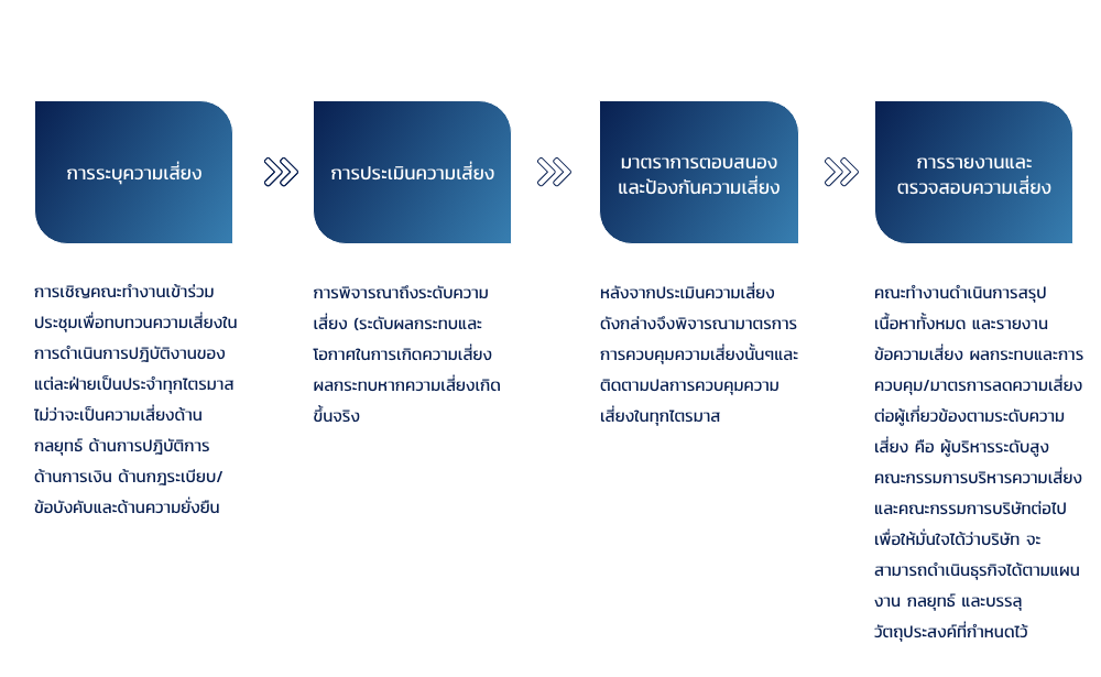 - การระบุความเสี่ยง: บริษัทมีการระบุความเสี่ยงที่เกี่ยวข้องกับการดำเนินงานของบริษัทอย่างน้อยปีละหนึ่งครั้ง หรือทุกครั้งที่มีการเปลี่ยนแปลงของปัจจัยเสี่ยงด้านปฏิบัติการต่างๆ ที่ส่งผลกระทบต่อการดำเนินงานของบริษัท