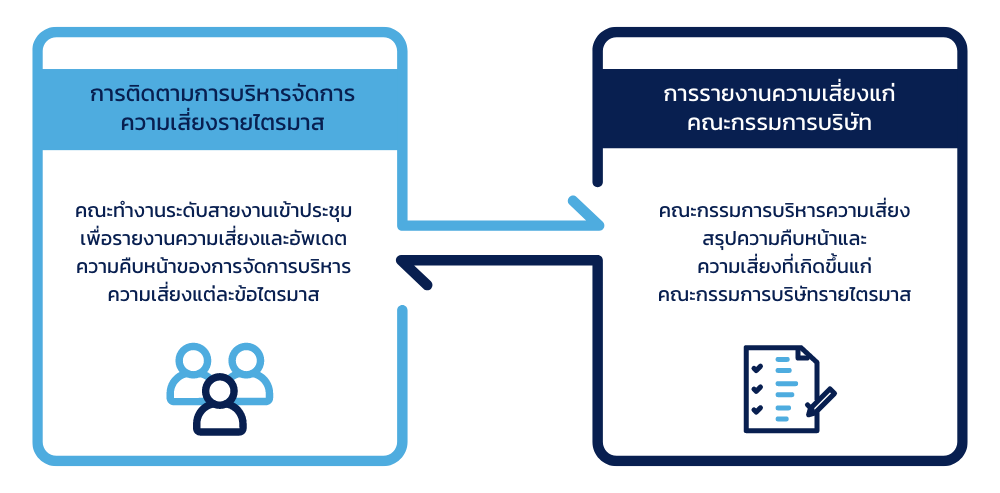 ทั้งนี้ หน่วยงานนักลงทุนสัมพันธ์และความยั่งยืนขององค์กรจะเป็นผู้ทวนสอบระดับปฏิบัติการหลังจากได้ทำการประชุมกับตัวแทนหน่วยงานบริหารความเสี่ยง เพื่อคัดกรองระดับความเสี่ยงในแต่ละหัวข้อ และนำหัวข้อที่มีความเสี่ยงสูงและสูงมากเข้ารายงานคณะกรรมการบริหารความเสี่ยงและคณะกรรมการบริษัทต่อไป เพื่อหารือและหาแนวทางในการแก้ไขร่วมกัน ทั้งนี้ หน่วยงานนักลงทุนสัมพันธ์และความยั่งยืนขององค์กรจะมีการติดตามถึงความเสี่ยง กระบวนการในการบริหารความเสี่ยงของแต่ละแผนกเป็นรายไตรมาส เพื่อนำเสนอให้คณะคณะกรรมการบริหารความเสี่ยงและคณะกรรมการบริษัททราบเช่นกัน