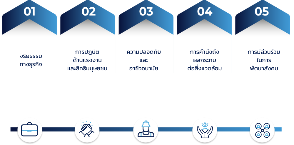 - กำหนดให้มีการจัดหาและคัดเลือกคู่ค้าอย่างโปร่งใส เป็นธรรม ตรวจสอบได้ รวมทั้งปฏิบัติตามระเบียบ ข้อกำหนด และกฎหมายที่เกี่ยวข้องอย่างเคร่งครัด รวมถึงคำนึงถึงความเสี่ยงครอบคลุมทั้งด้านเศรษฐกิจ สังคม และสิ่งแวดล้อม นอกจากนี้บริษัทให้ความสำคัญกับการต่อต้านการแข่งขันอย่างไม่เป็นธรรมในทุกรูปแบบ และจะไม่เรียกหรือรับ หรือจ่ายผลประโยชน์ใดๆ ที่ไม่สุจริตในการค้ากับคู่ค้าโดยเด็ดขาด