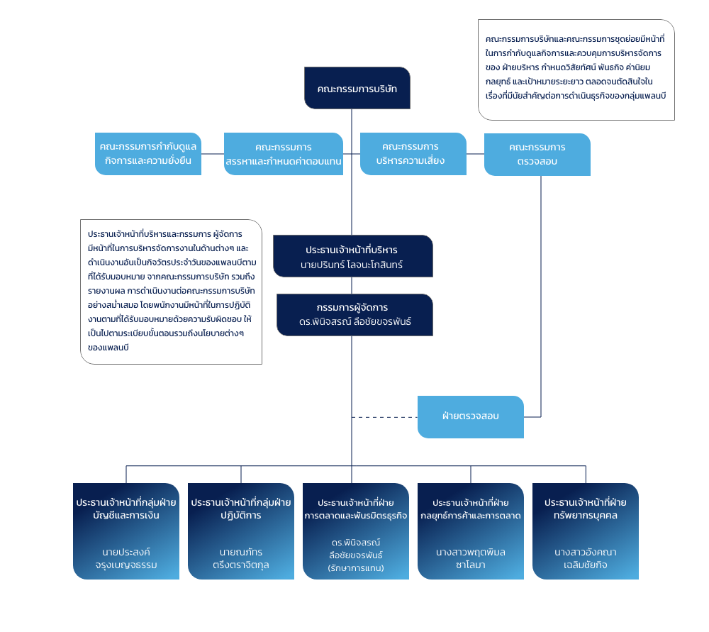 แพลนบี จึงได้กำหนดโครงสร้างการประกอบธุรกิจ ระบบบริหารจัดการ และระบบการกำกับดูแลกิจการที่สนับสนุนและสอดคล้องกับหลักการกำกับดูแลกิจการที่ดีของตลาดหลักทรัพย์แห่งประเทศไทย สำนักงานคณะกรรมการกำกับหลักทรัพย์และตลาดหลักทรัพย์ (“สำนักงาน ก.ล.ต.”) ข้อแนะนำของสมาคมส่งเสริมสถาบันกรรมการบริษัทไทยและมาตรฐานสากลต่างๆ